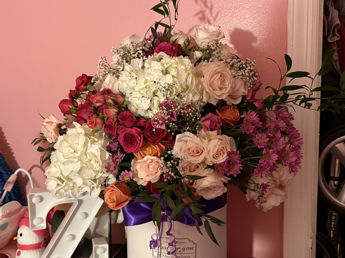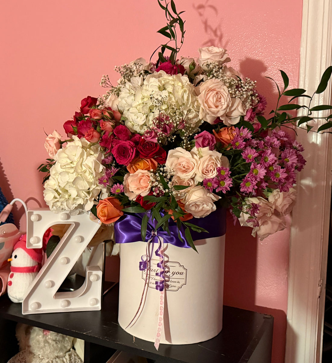 Big floral arrangement -pink roses -orange rose -hydrangeas -light pink rose -red roses (more...