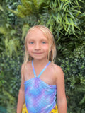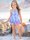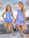 * L.O.L. SURPRISE!™ Splash Queen mermaid print two-piece swimsuit with tankini top, adjustable halter-tie straps, ruffle tulle hem with L.O.L. SURPRISE!™ embroidered logo, and short-style swim bottoms * Available in sizes 2T-10Y for toddlers and girls