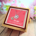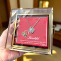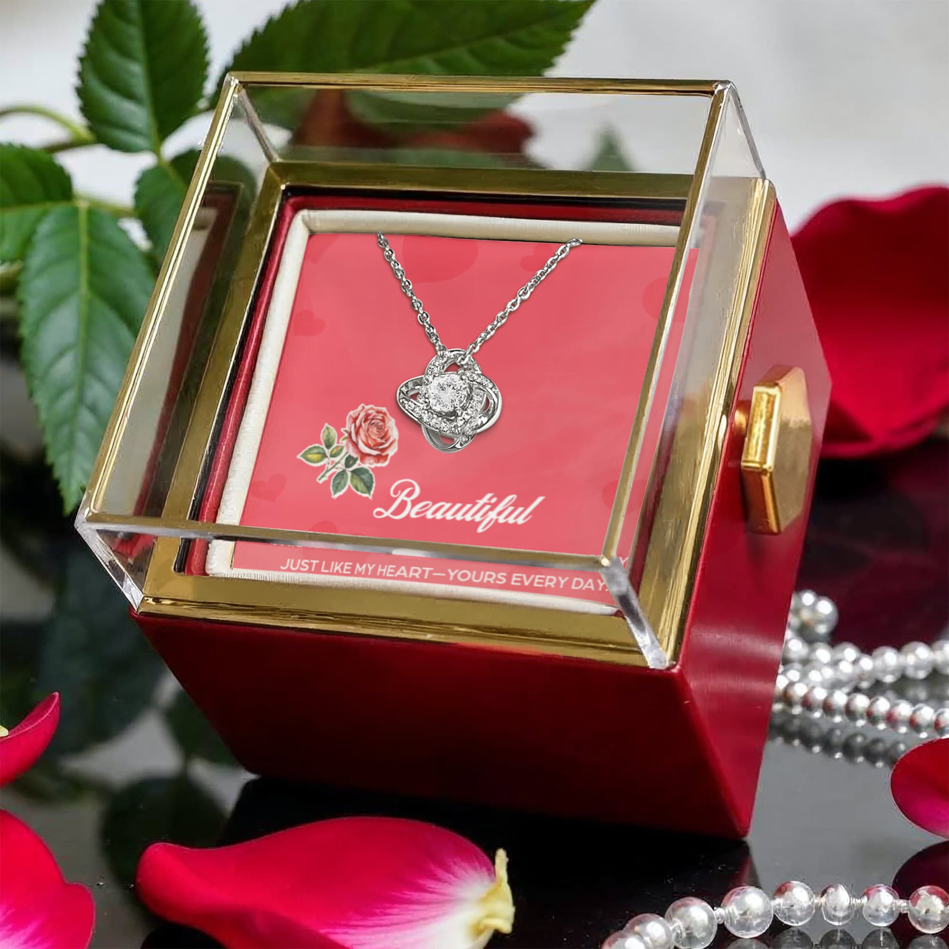 Imagine her reaction as she receives this beautiful Love Knot Necklace. Representing an unbreakable bond between two souls, this stunning pendant is adorned with premium cubic zirconia crystals, making it a timeless symbol of love and devotion. The luxurious box, featuring a meticulously preserved rose that never fades, adds an extra touch of love. With a simple turn of the gold knob, her breathtaking gift is revealed—making it the perfect sentimental gift for that special someone.