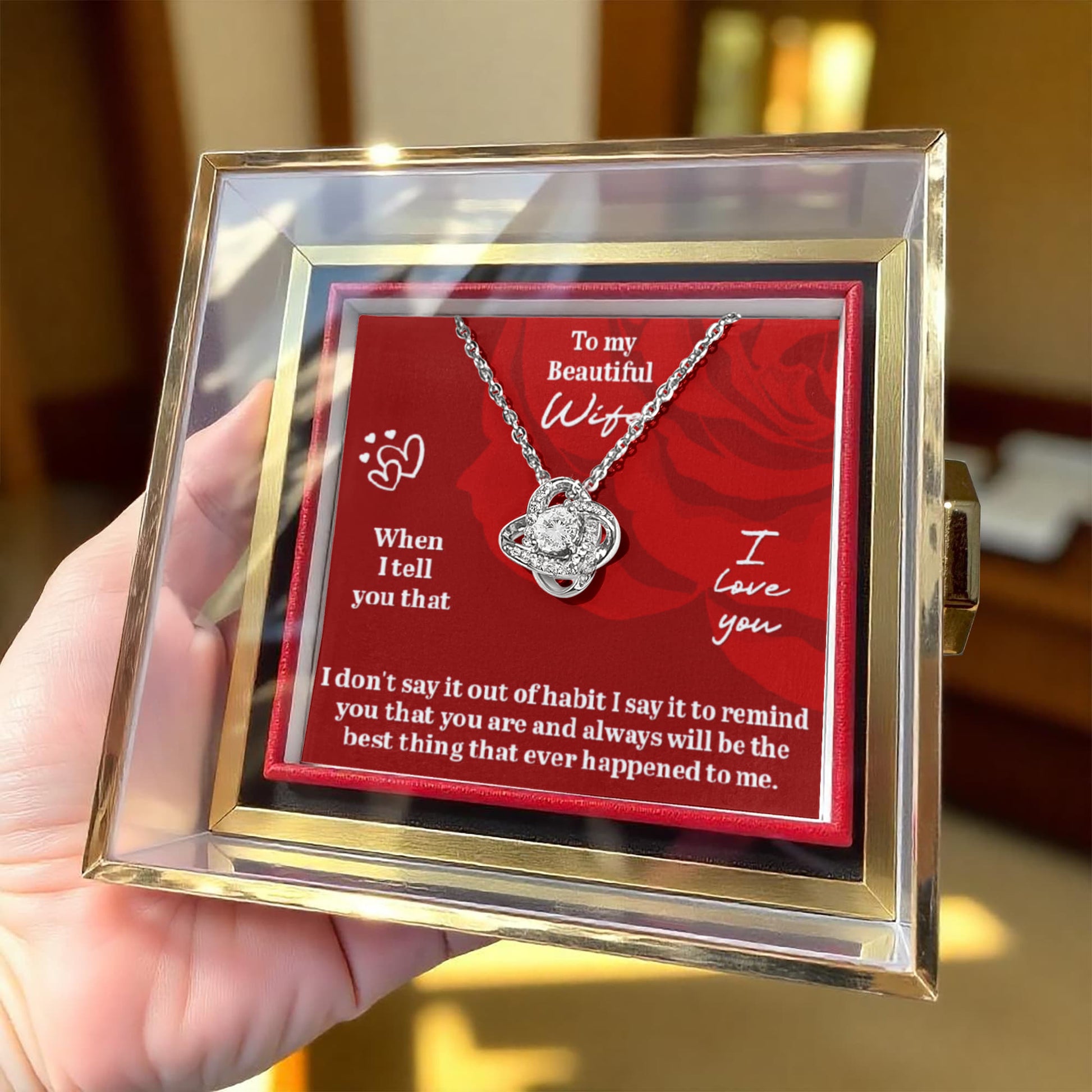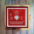 Imagine her reaction as she receives this beautiful Love Knot Necklace. Representing an unbreakable bond between two souls, this stunning pendant is adorned with premium cubic zirconia crystals, making it a timeless symbol of love and devotion. The luxurious box, featuring a meticulously preserved rose that never fades, adds an extra touch of love. With a simple turn of the gold knob, her breathtaking gift is revealed—making it the perfect sentimental gift for that special someone.
