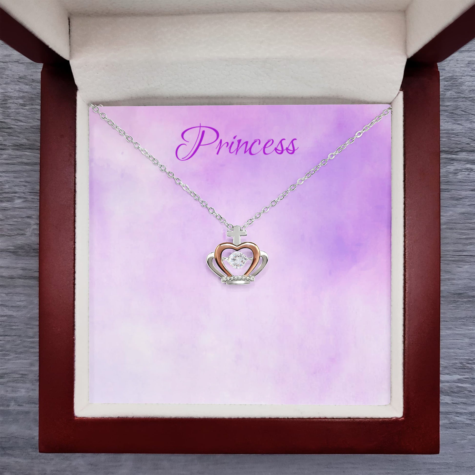 Imagine her reaction receiving this stunning Crown Pendant Necklace. Designed to resemble a regal crown, this exquisite piece features a dazzling cubic zirconia crystal at its center, catching the light with every movement. The delicate blend of silver and rose gold tones adds a touch of timeless beauty, making it the perfect gift for someone who reigns over your heart.